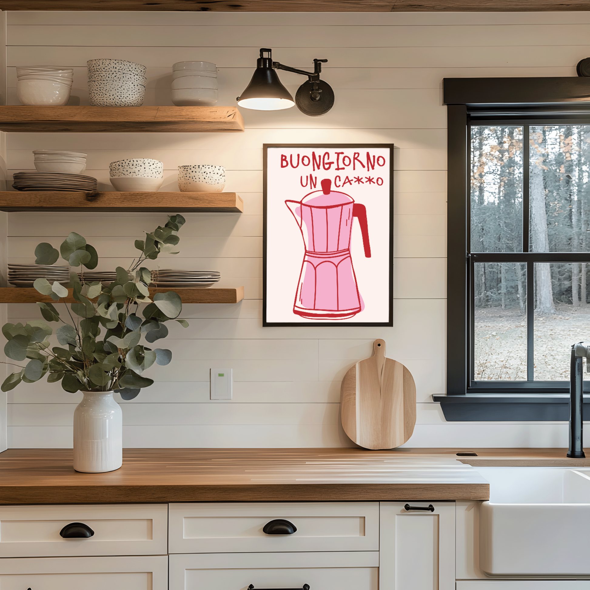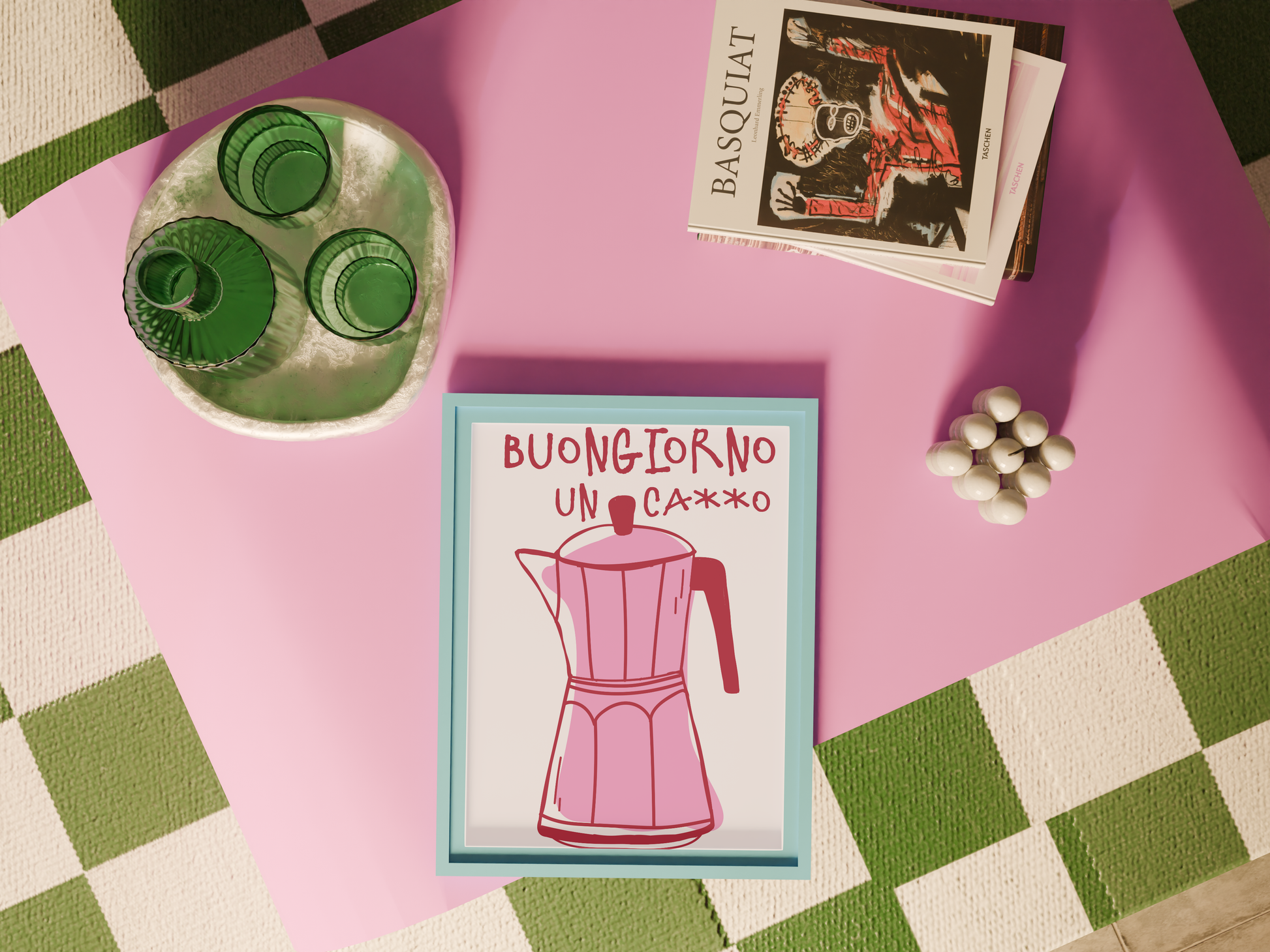 Se il tuo risveglio non è mai dei migliori senza un caffè forte e deciso, questa illustrazione è fatta apposta per te! "Buongiorno un ca**o" è un'opera che mescola minimalismo, ironia e uno stile grafico moderno, perfetta per chi ama iniziare la giornata con un pizzico di sarcasmo (e tanta caffeina!).